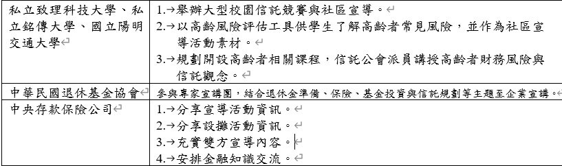 信託公會理事長邱月琴表示,信託公會近年來積極與不同單位合作向不同階層的民眾推廣信託。以大專與高中職學生為例,由公會主辦「校園信託扎根計畫」,委請致理科技大學執行大專生與高中職競賽活動與社區推廣;並與私立銘傳大學簽訂產學合作備忘錄,至高中職介紹信託;另外也積極與執行教育部「大學社會責任(University Social Responsibility, USR)實踐計畫」的大專院校系所尋求合作,並已與國立陽明交通大學簽訂合作意向書,合推高齡者相關課程,讓信託教育扎根校園;在企業推廣方面,透過與中華民國退休基金協會合作組成專家宣講團,結合退休金準備、保險、基金投資與信託規劃等主題,向企業雇主與勞工推廣多元金融知識;在一般民眾、原住民新住民與婦女等族群方面,公會規劃執行「村里辦信託宣導行腳計畫」與「信託方舟啟航計畫」,結合信託業與中央存保公司的資源,將信託及存款保險觀念介紹給村里辦與團體,讓更多高齡者能意識到財產安全與存款保險的重要。